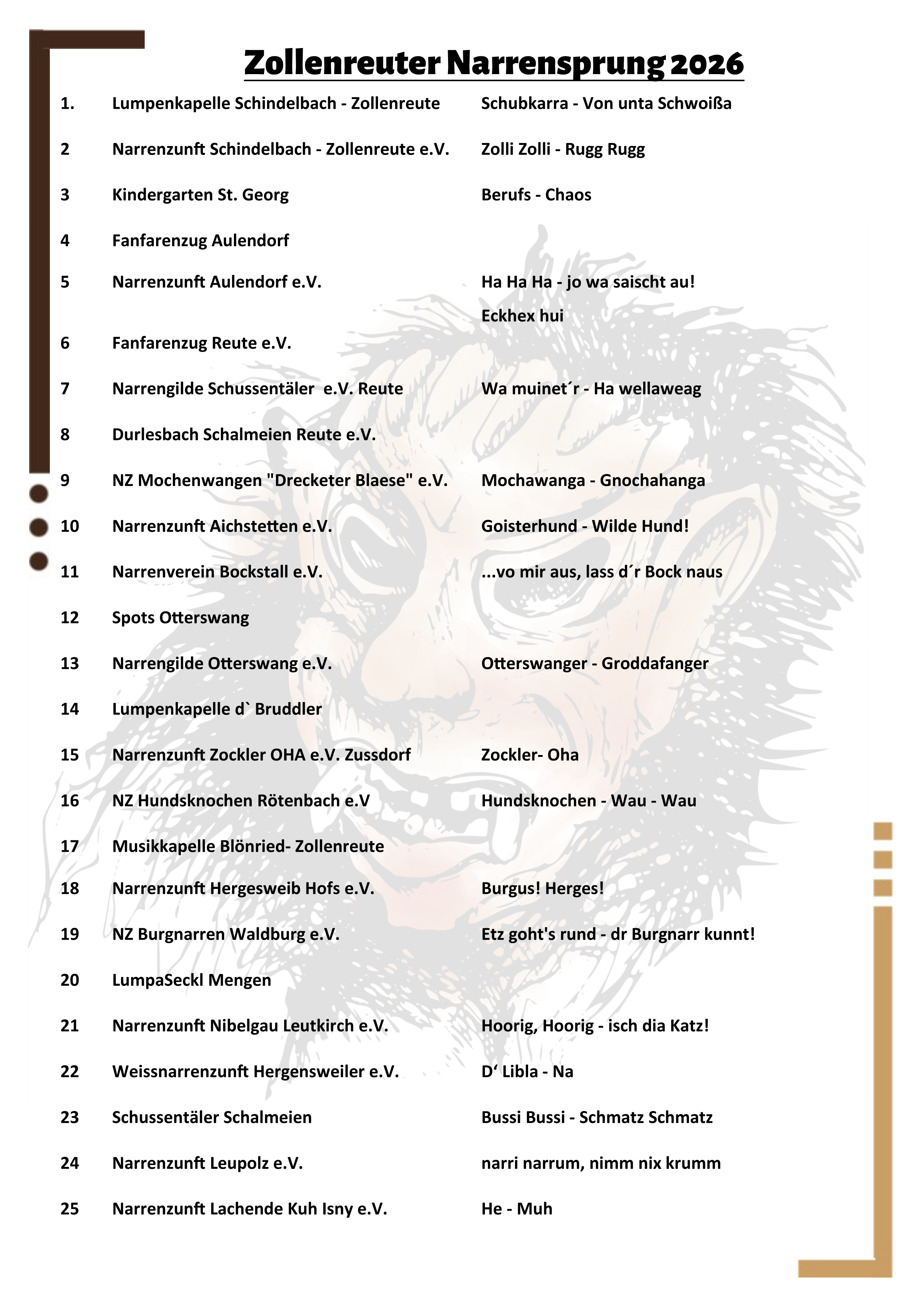 Die Lumpenkapelle Zollenreute feiert im Jahr 2026 ihr 10-jähriges Bestehen und wir feiern gemeinsam dieses Ereignis mit unserem Narrensprung am 24.01.2026 um 16:16 Uhr bei uns in Zollenreute.